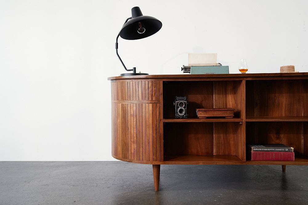 Discover the timeless elegance of Nordic design with this vintage curved desk featuring a kidney-shaped silhouette inspired by mid-century Danish craftsmanship. Expertly handcrafted from solid matured teak wood using traditional carpentry techniques, this statement piece seamlessly blends functionality with sophisticated aesthetics. The desk features a practical drawer and storage compartments on one side, plus open shelving on the other for displaying books and decorative items. A rounded swing door with wooden slats pays homage to classic Western tambour writing desks, while minimalist pencil legs provide sturdy support.